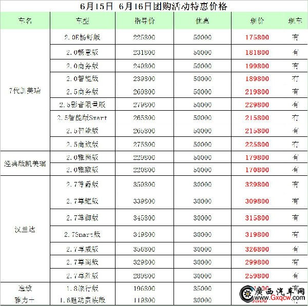 為答謝廣汽豐田客戶的關(guān)懷與支持,廣汽豐田大輿邕賓店特別在6月15-16日推出了團(tuán)購(gòu)嘉年華--年中促銷(xiāo)活動(dòng),更有渠道周年紀(jì)念版車(chē)型限量出售,凱美瑞2.0智能版、2.0雅尚版鉅惠50000元,漢蘭達(dá)2.7尊爵版鉅惠30000元,讓您享惠樂(lè)不停!