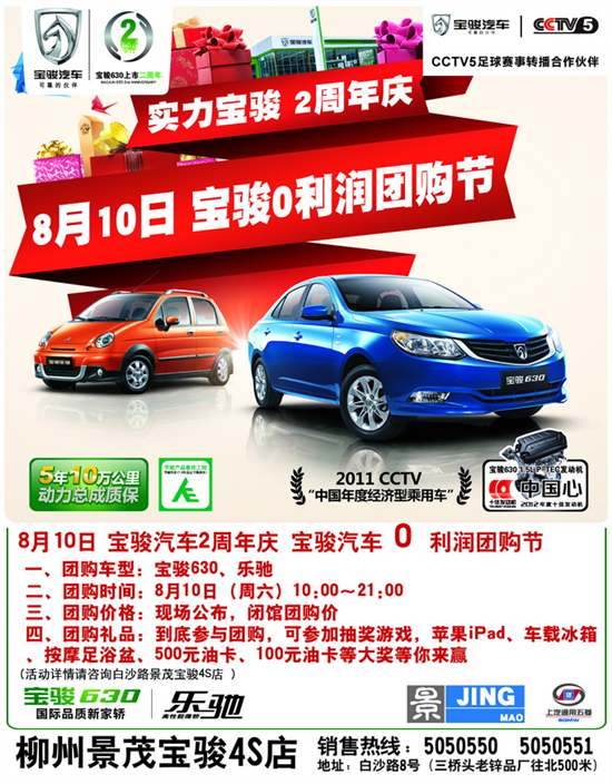為了回饋新老客戶(hù)對(duì)寶駿品牌的支持,在寶駿630上市兩周年之際,我公司決定于8月10日在店內(nèi)舉辦2013寶駿汽車(chē)周年慶生超值團(tuán)購(gòu)“惠”,活動(dòng)當(dāng)天進(jìn)店的顧客,即可免費(fèi)獲得寶駿630兩周年精美紀(jì)念品一份,活動(dòng)當(dāng)天訂車(chē)、購(gòu)車(chē)尊享團(tuán)購(gòu)特惠價(jià),還有Ipad大獎(jiǎng)等你來(lái)贏取哦!