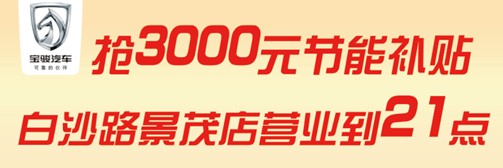 白沙路景茂店急客戶所急,為讓更多的車友能享受到國家節(jié)能補(bǔ)貼的優(yōu)惠,特將營業(yè)時(shí)間延長的晚上21:00點(diǎn)。
