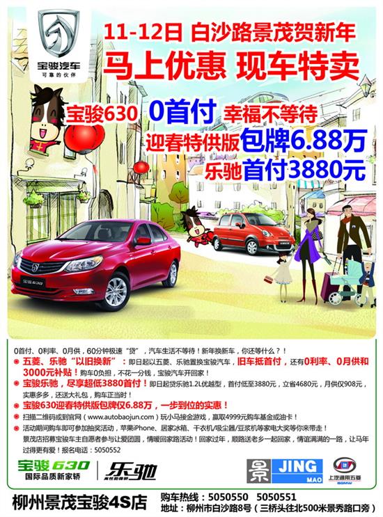 柳州人開柳州車!作為本土品牌,寶駿汽車得到了廣大龍城百姓的擁躉!借馬年即將來臨之際,白沙路景茂4s店;聯(lián)合上汽通用五菱一起開展多種多樣的回饋活動!現(xiàn)車限時特賣好實惠,還有抽獎和玩游戲贏禮品!禮多獎大,趕快到我們展廳來看看吧!