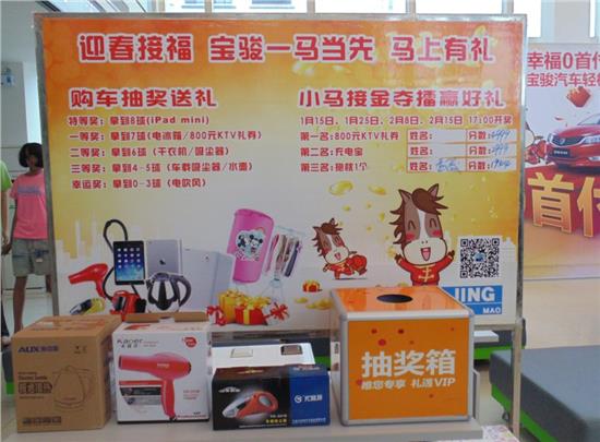 樂;顒铀模旱降曩徿嚦榇螵。 活動期間購車即可參加抽獎活動,100%中獎率,蘋果iPhone、冰箱、干衣機/吸塵器/豆?jié){機等大獎等你來拿!同時玩小馬接金游戲擺擂臺,一周排名前三名可獲得景茂店贈送的擂主大禮!