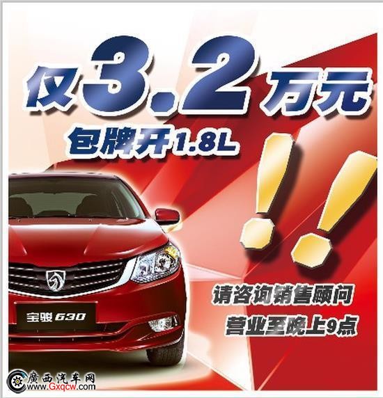 所有到店辦理車貸的客戶享超低價格,寶駿630-1.8L只要3.2萬,輕松“貸”回家,還享的1.8萬大禮!僅限八臺!機(jī)會不容錯過!