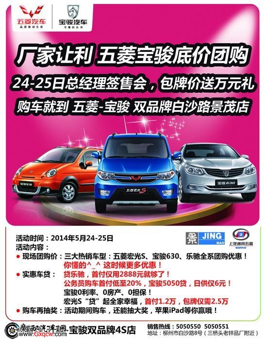 作為柳州人驕傲的本土品牌寶駿,近水樓臺(tái)先得月,廠家大幅讓利,在5月24-25號(hào)上午10:00時(shí),景茂寶駿4S店將舉行盛大的總經(jīng)理簽售會(huì)活動(dòng)!