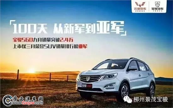 寶駿首款SUV車型寶駿560自今年7月上市以來,繼首月銷售9158輛后,8月以17128輛成功躋身SUV細(xì)分市場前三甲,創(chuàng)造了車市*新成長速度,9月銷量攀升至24,228輛,再創(chuàng)喜人成績,榮登SUV銷量排行榜亞軍!