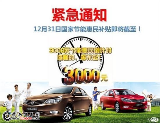 12月31日前購買2014款手動檔寶駿630/寶駿610,即可享受3000元節(jié)能惠民補貼,欲購從速,樂享實惠!