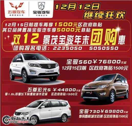 11月15日-12月15日,我區(qū)開展“2015年廣西汽車消費月活動”,對全區(qū)的單位和城鄉(xiāng)居民購買廣西企業(yè)生產(chǎn)的汽車給予補貼。購買五菱寶駿全系任意車型可享1500元政府補貼。ɑ顒悠陂g在廣西境內(nèi)購買五菱寶駿車型,且購車者為廣西區(qū)內(nèi)單位或擁有廣西居民身份證的個人,以購車發(fā)票為準),優(yōu)惠還有*后幾天,欲購從速!