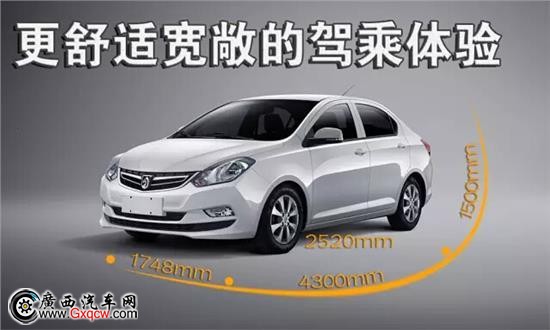寶駿3304300*1748*1500mm的車身尺寸,讓其擁有寬敞的車身寬度和充裕的縱向高度,寶駿330的后排座椅在輕松容納3人乘坐后,尚有一定富余空間,且前后排駕乘人員的頭部空間同樣寬裕。此外,寶駿330的軸距達(dá)到了2520mm,后排人員的膝部空間足有864mm,配上寬大舒適的座椅,為全家出行打造出寬敞舒適的駕乘空間。