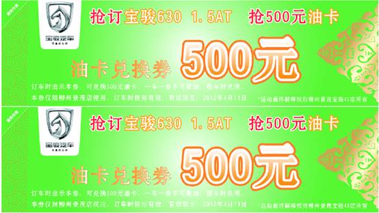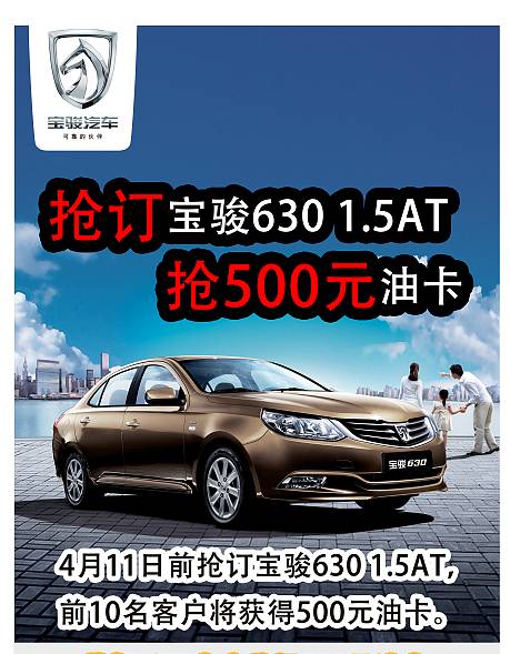 活動內(nèi)容:在4月11日前訂購寶駿630 1.5AT的前10位客戶,可獲得白沙路景茂4S店提供的500元油卡實惠大禮包。