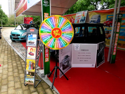 展位剛剛搭建好,就吸引很多好奇小朋友的“旋轉盤”。連不少大人見了都忍不住伸手轉一把試試手氣,真是童心未泯。不過轉盤上的顏色花花綠綠倒也相映成趣了不是?后來這個轉盤在熱情的車友“撫摸”下,整個卸倒了⊙╊⊙b汗!