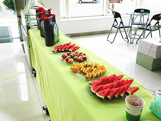 鮮嫩多汁的水果散發(fā)陣陣香氣,系著紅綢的禮物也在向新車主“招手”