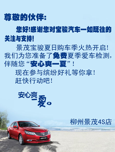 景茂寶駿溫馨提示:夏季行車,您的車輛更需要針對夏季保養(yǎng)維護(hù)!景茂寶駿秉承“以客為尊,與您相伴”的服務(wù)宗旨,正在為您的愛車提供免檢服務(wù)。