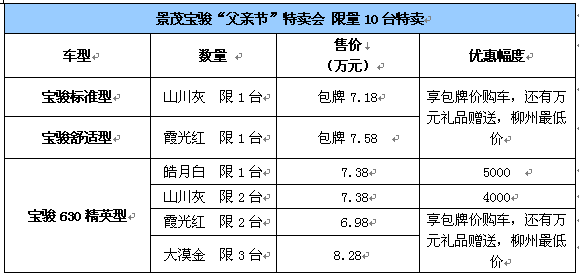 6月16—17日景茂寶駿將在店頭舉辦“父親節(jié)專場團購特賣會”,推出10臺特賣車型特價銷售,機會難得,趕快行動哦!