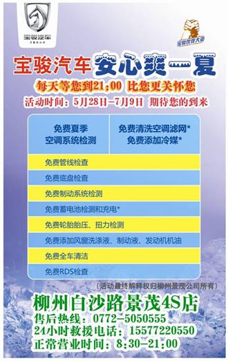 景茂寶駿4S店,深刻了解客戶時間寶貴,為客戶節(jié)省時間,即是*大的服務價值體現(xiàn)!現(xiàn)為了提高服務質量,讓客戶滿意,景茂寶駿店推出:“清新健康風安心爽一夏”活動,多項針對用戶行車保養(yǎng)問題,給予貼心,又實惠的服務。