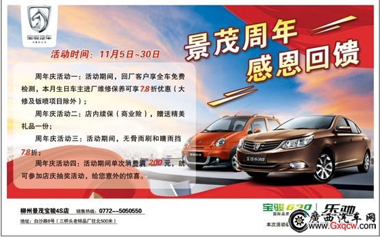 景茂寶駿一直把為消費者提供*優(yōu)質(zhì)的產(chǎn)品和*優(yōu)秀的服務(wù)當(dāng)作*大的目標(biāo)。伴隨著景茂寶駿4S店1周年慶典的開展,為答謝一直以來關(guān)心和支持柳州景茂的用戶們,即日起到30日另一場別開生面的“景茂周年 感恩回饋”活動在柳州景茂寶駿4S店上演。在這個微涼的深秋送去我們最誠摯的關(guān)懷。
