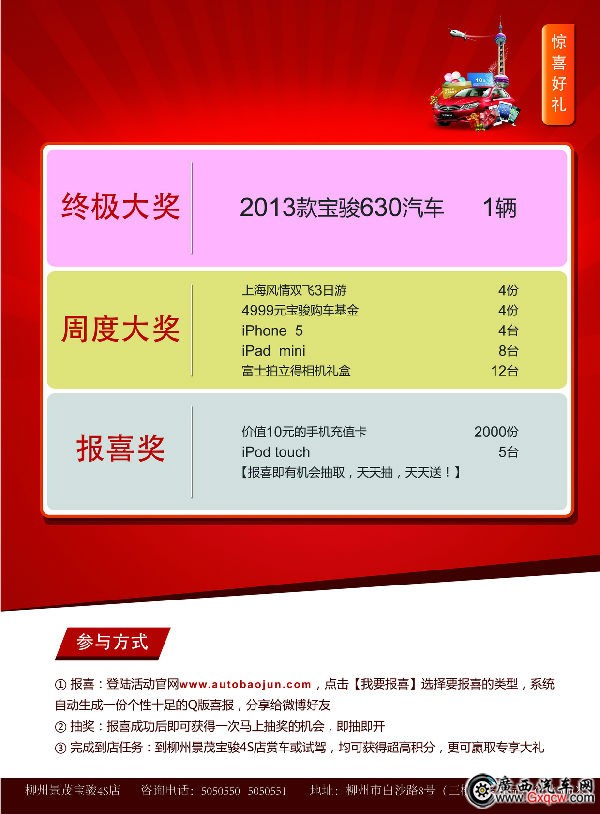 活動一:在活動期間登陸寶駿汽車官方網(wǎng)站,用戶可以使用“新浪微博”和“騰訊微博”帳號登陸,勾選“報喜”類型并點(diǎn)擊“確認(rèn)”,點(diǎn)擊“提交”完成報喜提交,點(diǎn)擊“馬上抽獎”便可參與即時抽獎活動;多次重復(fù)完成活動一也可參加抽獎活動,同一ID可多次報喜,兩次報喜之間時間間隔不少于1小時;同一ID一天之內(nèi)可能有多次抽獎機(jī)會(如當(dāng)天還未中過獎,報喜成功即可抽獎),但只有一次中獎機(jī)會;點(diǎn)擊“我的報喜”,選擇微博賬號登陸,進(jìn)入后選擇想要分享的喜報,點(diǎn)擊“一鍵分享”,勾選想要分享到的社交平臺,按照提示“登陸”后完成即可;