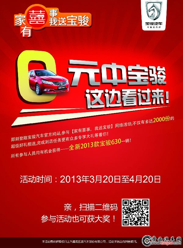 家有喜事精神爽,寶駿為您錦上添花送豪禮!凹矣邢彩,我送寶駿”第二季購車優(yōu)惠活動春季重磅來襲!即日起登陸寶駿汽車官方網(wǎng)站,關(guān)注“家有喜事,我送寶駿”活動。獎品多多送不停,寶駿汽車等你贏。