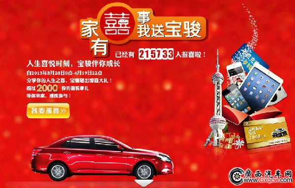 家有喜事,我送寶駿的活動獎品非常豐富。報喜就有獎。只要您的積極參與。