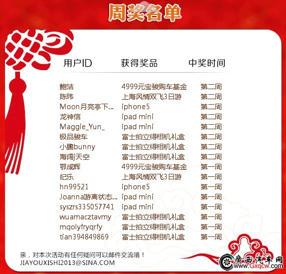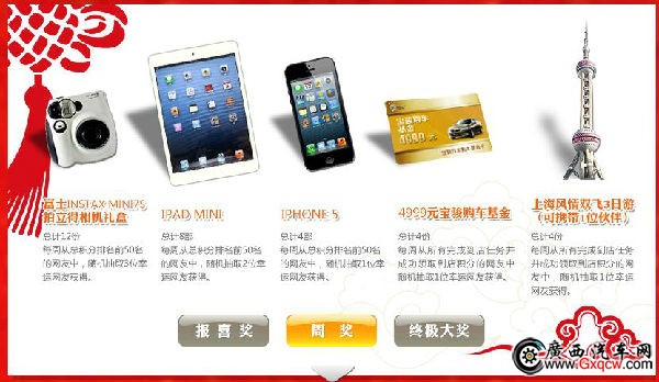 周獎的禮品更為豐厚,有富士拍立得相機禮盒、IPAD MINI、IPHONE 5、4999元的寶駿購車基金、上海風情雙飛3日游(可攜帶1位伙伴)。
