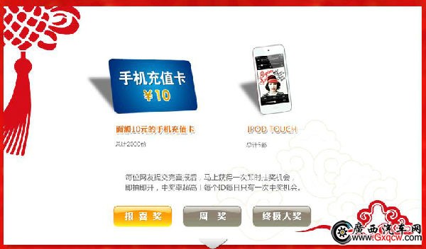 報喜獎有:10元面額的手機充值卡和IPOD TOUCH。
