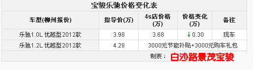 現(xiàn)在到柳州景茂購寶駿樂馳1.0L優(yōu)越型優(yōu)惠3000元。寶駿樂馳1.2L優(yōu)越型購車3000元節(jié)能補貼+3000元購車禮包,有現(xiàn)車。