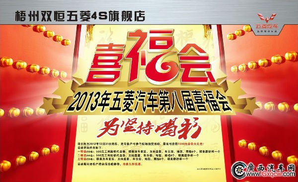 梧州雙恒為了感謝新老客戶一直以來(lái)給予五菱汽車的支持,給廣大客戶送上祝福。隨著一年一度的新年“喜福會(huì)“再度全國(guó)展開(kāi),即日起至2012年12月31日購(gòu)車、定車客戶可參與現(xiàn)場(chǎng)抽獎(jiǎng)活動(dòng),*高可獲得1500元豪華大禮包!