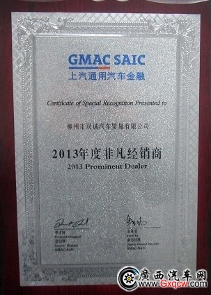 柳州市雙誠汽車貿(mào)易有限公司榮獲上汽通用汽車金融2013年度非凡經(jīng)銷商