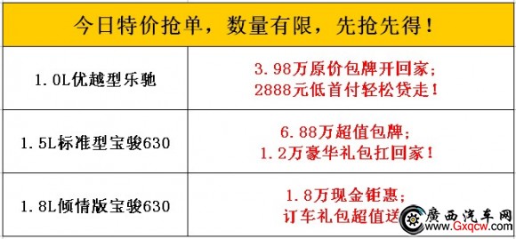 全系搶單——為慶賀寶駿610新伙伴的加入,寶駿家族全系鉅惠支持,無論是喜愛寶駿樂馳還是寶駿630的伙伴也可享受到驚喜福利: