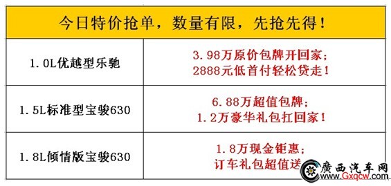 放價(jià)三、特推出寶駿630 1.8L特惠版,直降1.8萬,剩下的1.8萬可支付另一臺(tái)寶駿汽車的首付,讓您買一臺(tái)得兩臺(tái)!