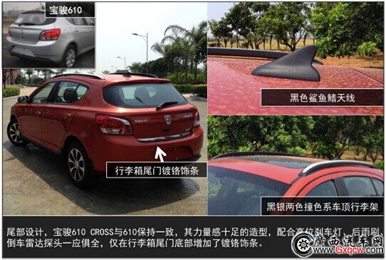 尾部設(shè)計(jì)方面,寶駿610 CROSS在原車型動(dòng)感造型基礎(chǔ)上增添鍍鉻飾條,不僅提亮整體車身線條,更提升行車時(shí)的視覺提示度,增強(qiáng)行車安全。車頂增設(shè)黑銀撞色行李架,配合黑色鯊魚鰭天線,更添運(yùn)動(dòng)感。