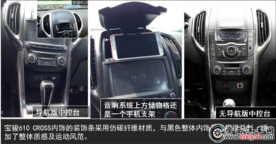 寶駿610中的多種亮銀色裝飾件,均被替換成了仿碳纖維材質(zhì),與寶駿610 CROSS整體內(nèi)飾風(fēng)格相得益彰。值得一提的是,在中控臺(tái)儲(chǔ)物盒內(nèi)還設(shè)計(jì)了手機(jī)夾持機(jī)構(gòu),能夠卡住iPhone、三星等市面上常見的各類手機(jī)。此外,寶駿610 CROSS設(shè)置了24處貼心儲(chǔ)物空間,與寶駿610相比CROSS版增加了行李箱網(wǎng)兜。