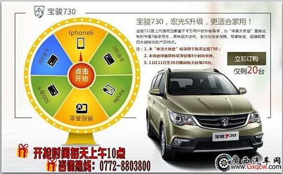 為回饋廣大伙伴朋友的信賴和選擇,為慶祝寶駿730上市以來取得的重重佳績,柳州雙誠寶駿攜手車享網(wǎng)重磅推出寶駿730專屬感恩活動(dòng),網(wǎng)上玩幸運(yùn)轉(zhuǎn)盤贏百分百好禮,到店成交更有驚喜實(shí)惠價(jià)和超值禮品等著你!活動(dòng)咨詢熱線:0772-8803800。