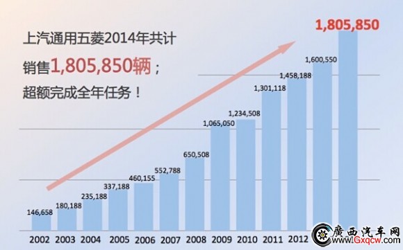 據(jù)*新數(shù)據(jù)顯示,2014年上汽通用五菱全年共計(jì)銷售新車1,805,850輛,不僅同比2013年增長13%,還超額完成了全年180萬輛的銷售目標(biāo)。合資12年以來,上汽通用五菱持續(xù)穩(wěn)步增長,12年間銷量更是增長了12.3倍。