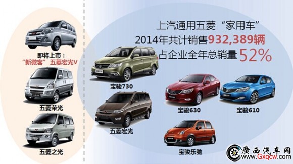 2014年,由五菱宏光全系、寶駿730、寶駿630、寶駿610、寶駿樂馳共同構(gòu)成的家用車產(chǎn)品陣營,共計(jì)銷售932,389輛,占到企業(yè)全年整車銷售總量的52%。