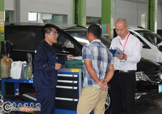 比賽技師正在跟嘉賓客戶耐心講解具體車況。