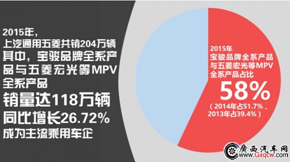 2015年,寶駿品牌全系產(chǎn)品與五菱宏光等MPV全系產(chǎn)品所構(gòu)成的乘用車產(chǎn)品矩陣,共計銷售1,181,810輛,占上汽通用五菱全年銷量58%,同比增長26.72%。由寶駿730、五菱宏光全系等組成的MPV產(chǎn)品陣營,2015年實現(xiàn)銷售1,000,007輛,為上汽通用五菱在MPV市場實現(xiàn)銷售同比增長14.80%,2015年1-11月市場份額達47.34%。乘用車產(chǎn)品的集中發(fā)力,成為上汽通用五菱向上發(fā)展的重要支柱。