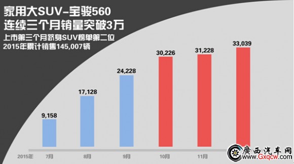 其中,2015年7月18日上市的寶駿560,在上市當天就取得開門紅,訂單數(shù)突破1.5萬,銷量迅速攀升,從10月份開始,連續(xù)3個月單月銷量突破3萬臺,2015年累計銷售145,007輛,創(chuàng)造了中國車市銷量的最快成長速度,在SUV紅海中成功開辟藍海。