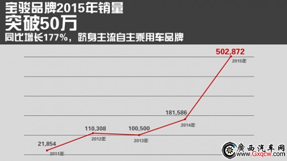 寶駿品牌是上汽通用五菱2010年發(fā)布的乘用車品牌,自2011年首款車型寶駿630上市,相繼推出了寶駿樂馳、寶駿610、寶駿730和寶駿560。2015年,在寶駿560和寶駿730兩款熱銷產(chǎn)品的拉動下,寶駿品牌共計銷售502,872輛,同比增長177%,使得寶駿品牌獲得爆發(fā)性增長,躋身主流自主乘用車品牌前列。