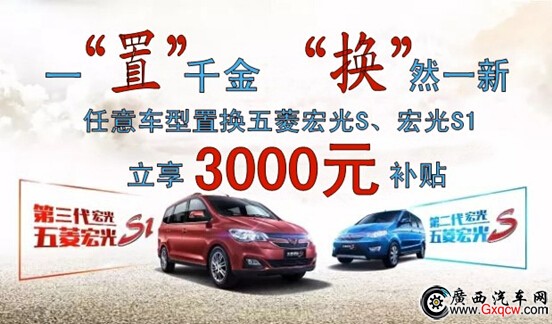 即日起至3月31日前,任意品牌二手車置換五菱宏光S、宏光S1,可享受3000元置換現(xiàn)金補(bǔ)貼!