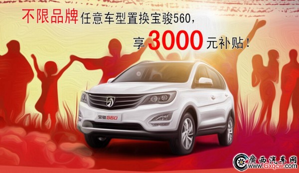 即日起至4月30日前,任意品牌二手車置換SUV寶駿560,可享受3000元置換現(xiàn)金補(bǔ)貼!