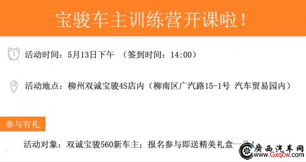 5月15日,汽貿(mào)園柳州雙誠寶駿店,即將舉辦“五菱寶駿車主訓練營”活動,通過大講堂等形式,讓車主更了解愛車養(yǎng)護知識、車輛續(xù)保知識,與專業(yè)寶駿管家面對面互動交流,零距離感受至誠服務。