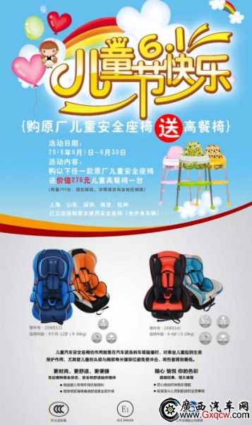 汽貿園柳州雙誠4S店特推出關愛兒童,六一特惠活動,活動期間到雙誠寶駿店,訂購原廠任意一款兒童安全座椅,將贈送高級兒童餐椅一臺!