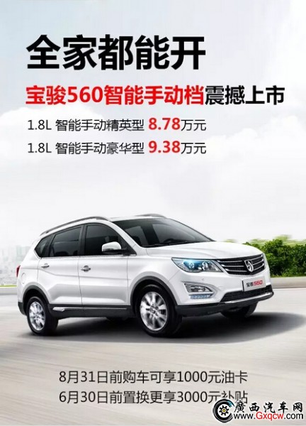 2016年6月8日,定位為“全家都能開”的寶駿560智能手動(dòng)檔正式上市。此次推出的1.8L智能手動(dòng)精英型和1.8L智能手動(dòng)豪華型售價(jià)分別為8.78萬元、9.38萬元。新車型在傳統(tǒng)手動(dòng)變速器基礎(chǔ)上,增加了電子系統(tǒng)TCU和換擋執(zhí)行器,取消了離合器踏板,用戶只需切換擋位即可輕松駕駛,是目前為止市場(chǎng)上**開、技術(shù)**的手動(dòng)擋產(chǎn)品,開創(chuàng)了全新的手動(dòng)駕駛模式!
