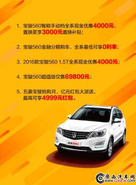 寶駿560智能手動檔、1.5T全系現(xiàn)金直降4000元!首付低至1.5萬!不限品牌置換再享3000元現(xiàn)金補貼!寶駿SUV,寬大更舒適,實在更實惠,安全更安心,您值得擁有!