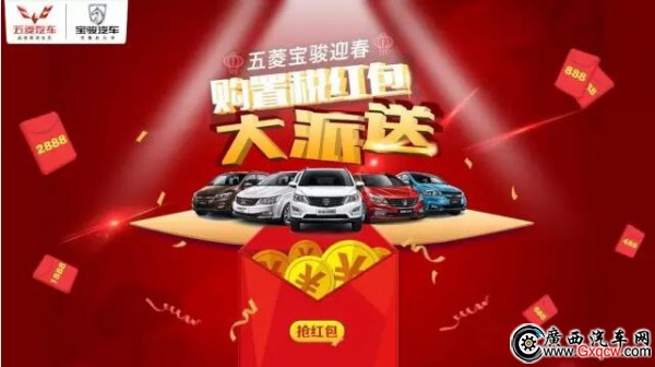 五菱寶駿汽車迎春購置稅紅包大派送。388-2888元紅包,訂車客戶即刻抽取;100%中獎(jiǎng)。抽到多少即可抵多少車款!機(jī)會(huì)不要錯(cuò)過!