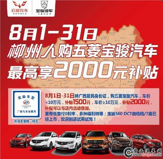 3.補(bǔ)貼禮:廣西消費(fèi)月8月份,只要您購買五菱寶駿均可享受*高2000元補(bǔ)貼,僅此一個(gè)月哦!速來搶優(yōu)惠!