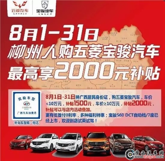 專(zhuān)屬補(bǔ)貼禮:廣西消費(fèi)月8月份,只要您來(lái)柳州雙誠(chéng)購(gòu)買(mǎi)五菱寶駿均可享受*高2000元補(bǔ)貼,13天倒計(jì)時(shí)哦!速來(lái)?yè)寖?yōu)惠!