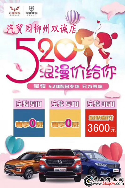不要等到錯過才說后悔,汽貿(mào)園五菱寶駿520告白專場,為愛加油,為愛放價!等你帶心儀的TA一起回家!