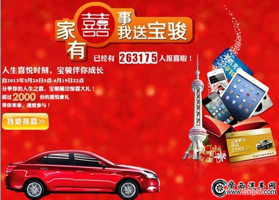 *后一周的周獎將于16日揭曉,還在報(bào)喜的朋友們可要抓緊時間累積積分呀,*后的寶駿汽車終極大獎將于20日揭曉,時間已經(jīng)不多,大家加把勁沖刺吧!現(xiàn)在就登錄寶駿汽車“家有喜事 我送寶駿”活動專區(qū)(http://www.autobaojun.com/jyxs)參與報(bào)喜吧!