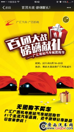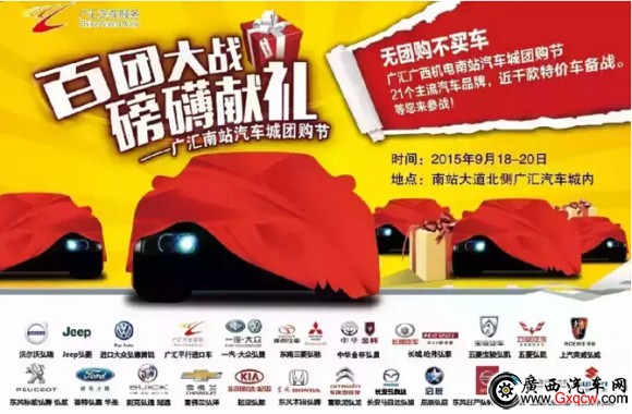 無團(tuán)購不買車,9月18-20號,廣匯廣西機(jī)電南站汽車城團(tuán)購節(jié),21個主流汽車品牌集結(jié),近千款特價車備戰(zhàn)。百團(tuán)大戰(zhàn) 磅礴獻(xiàn)禮 9月18-20號廣匯南站汽車城南站大道北側(cè)廣匯汽車城內(nèi),福特A8展位等您來參與!
