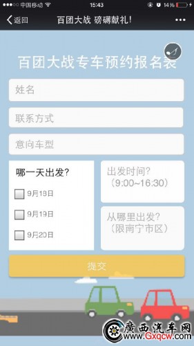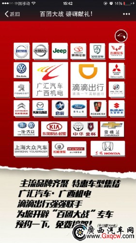 9月18-20日廣匯旗下主流品牌齊聚南站,特價車型蓄勢待發(fā)!廣匯汽車·廣西機(jī)電滴滴出行強(qiáng)強(qiáng)聯(lián)手,為您開辟“百團(tuán)大戰(zhàn)”專車,掃面二維碼,滴滴專車免費(fèi)送你參加南站車展,即刻免費(fèi)接駕!